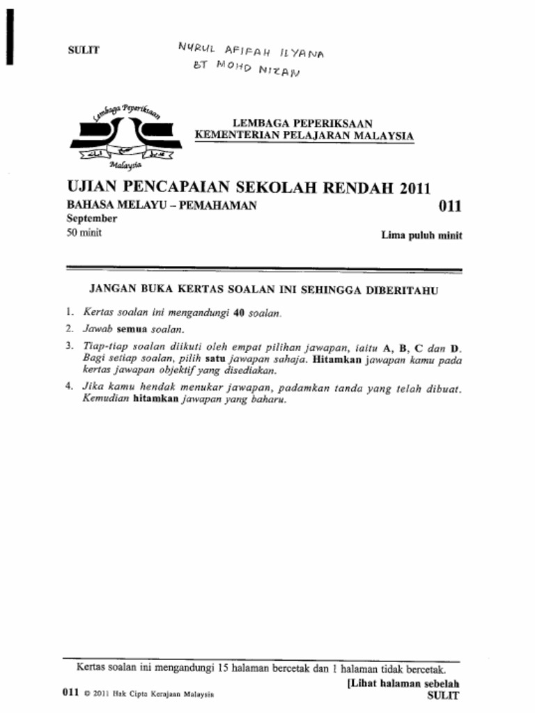 Contoh Ujian Upsr Bahasa Melayu Soalan Dan Jawapan